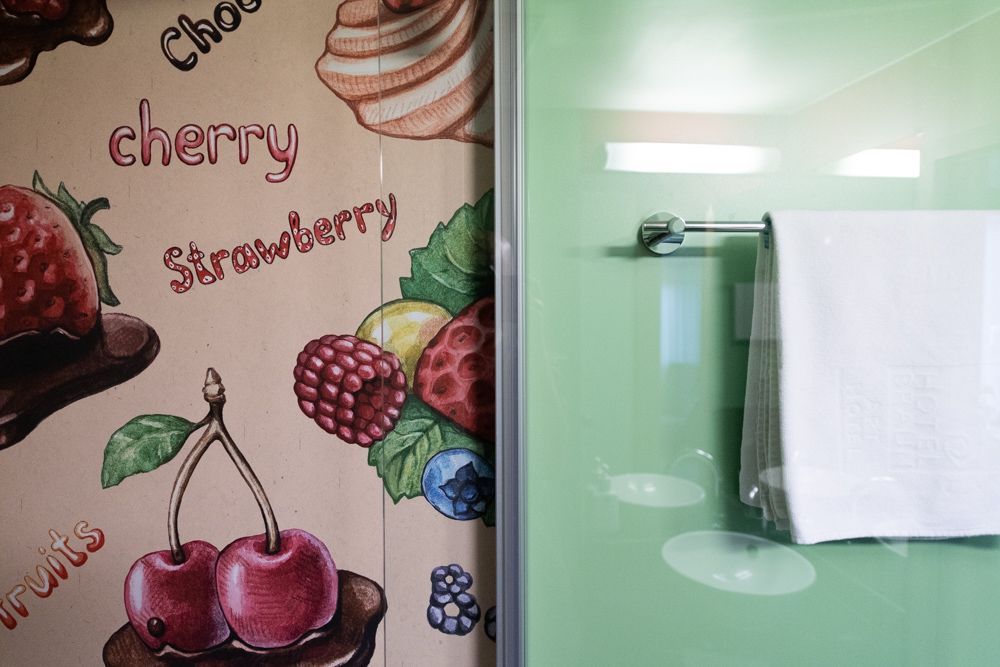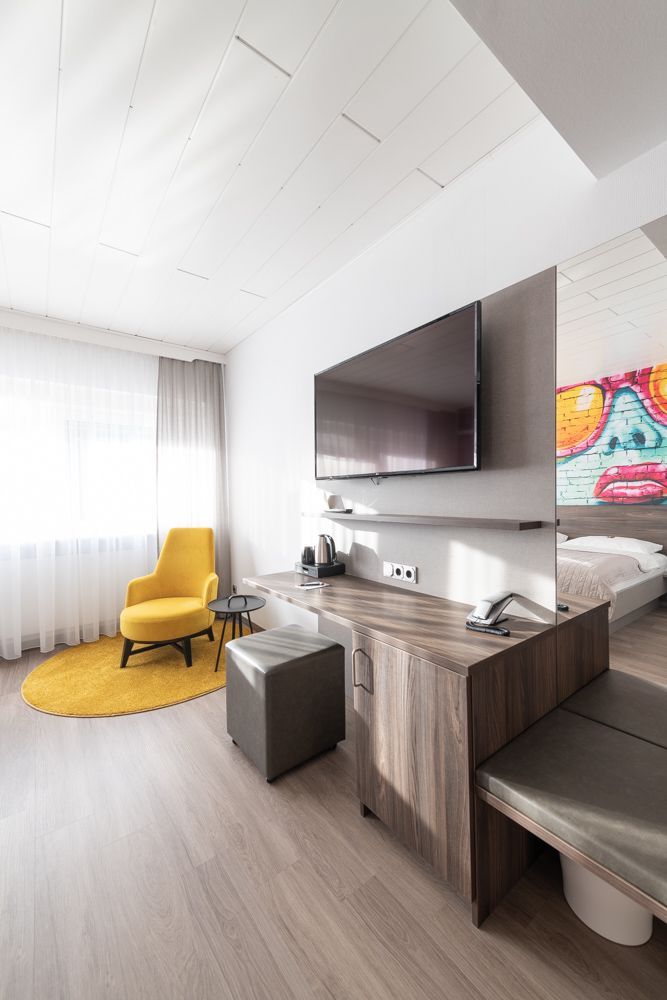Das schicke ART-Hotel und seine modernen Zimmer mit Klimaanlage und Lift können Sie kaum verfehlen, immerhin ziert die Hausfassade die „weltgrößte Spraybanane“ des internationalen Künstlers Thomas Baumgärtel.