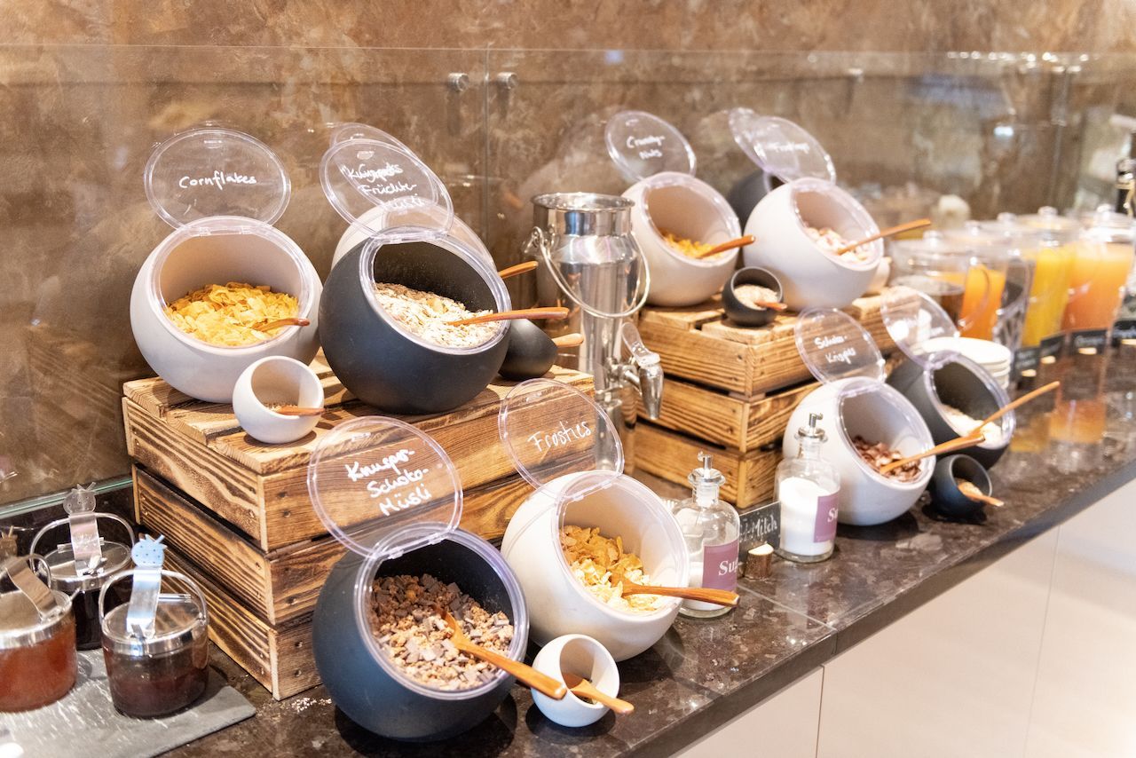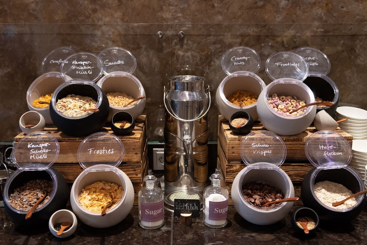 Unser Cerealien-Angebot lässt keine Wünsche offen: Zehn verschiedene Sorten bilden die Basis für einen individuellen Start in den Tag. Dazu wählen Sie aus einer Vielzahl an Toppings wie Leinsamen, Sonnenblumen- und Kürbiskernen und stellen sich Ihr Frühstück ganz nach Geschmack zusammen. Ob leicht, nährstoffreich oder besonders knusprig – hier beginnt der Morgen genau so, wie Sie ihn mögen. Auf Nachfrage halten wir immer eine lactosefreie Hafermilch für Sie bereit.