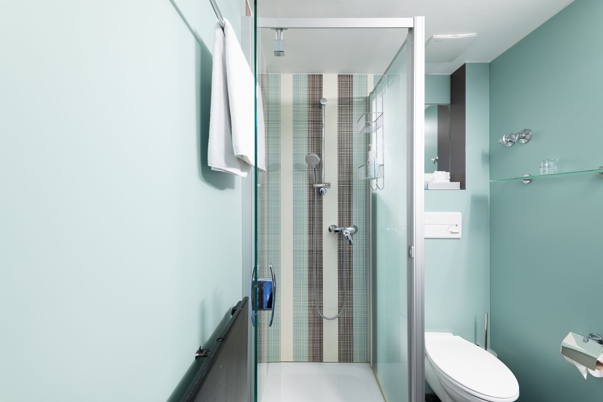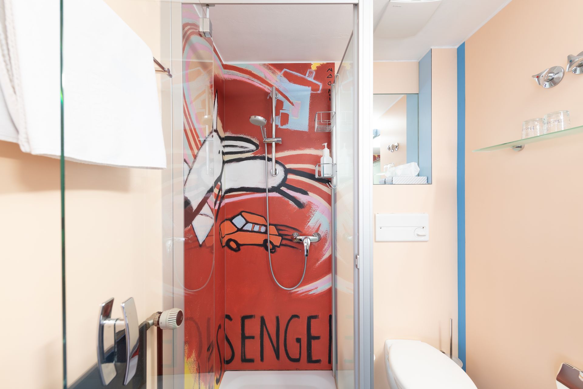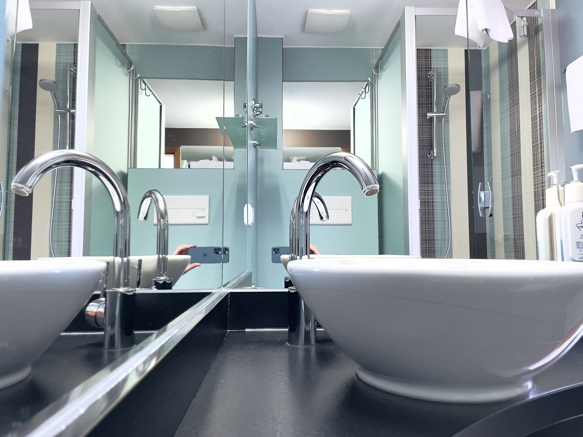 Die Badezimmer machen den Hauptunterschied zur StandART Kategorie aus, mit großflächig verspiegelten Wänden und Naturstein aus Italien.