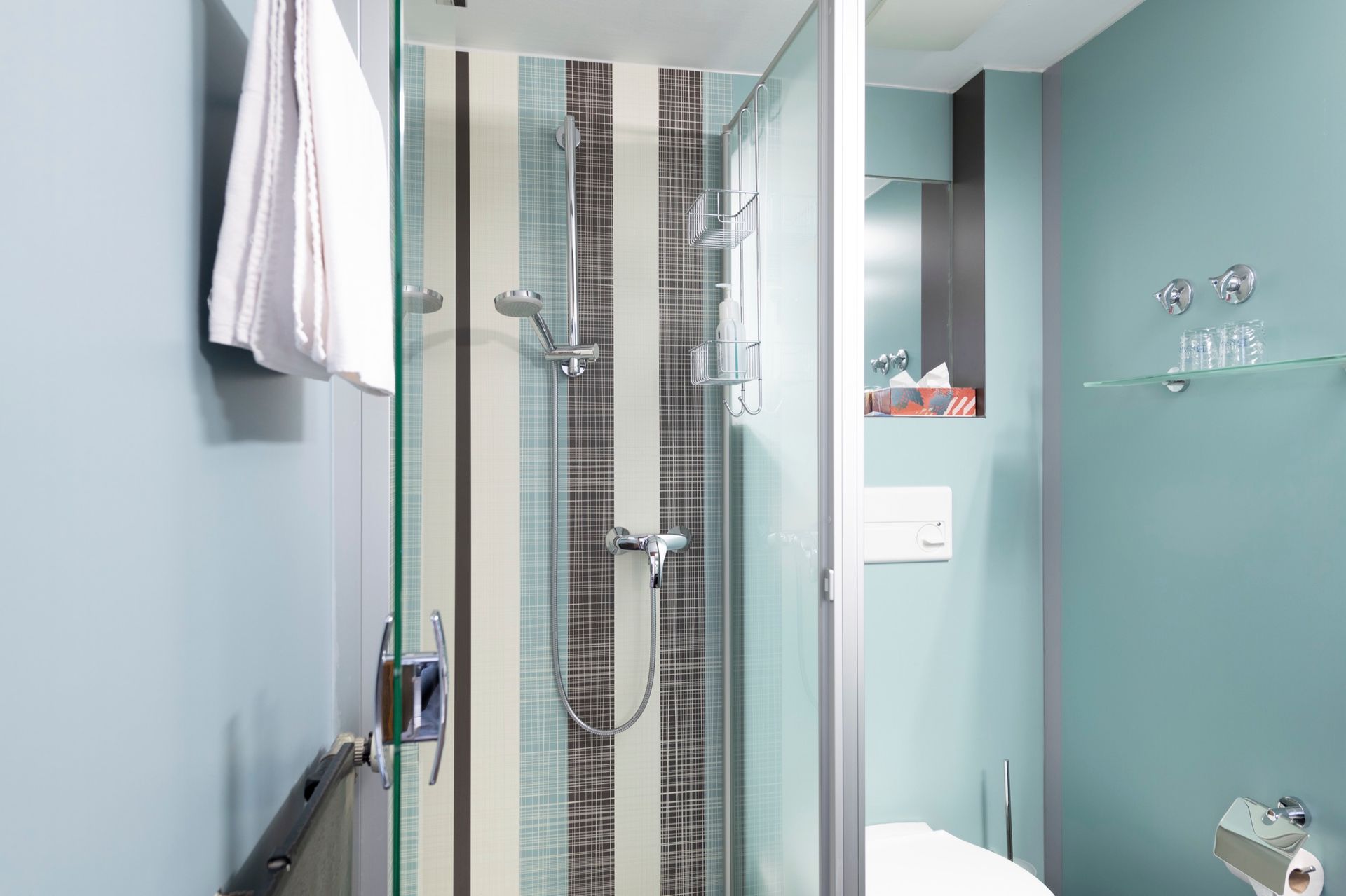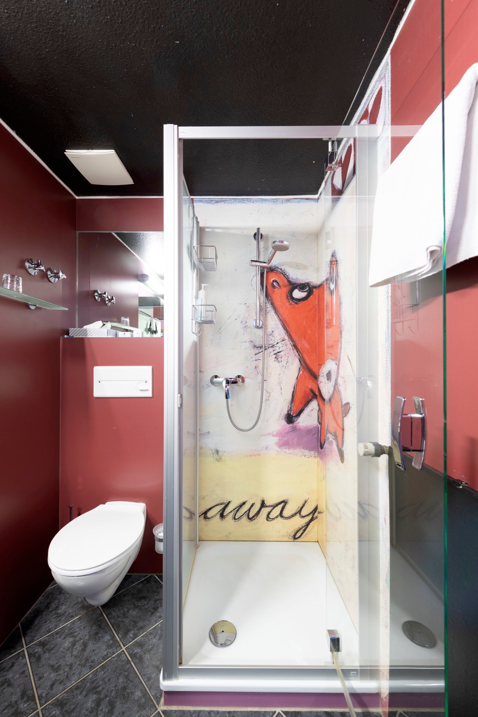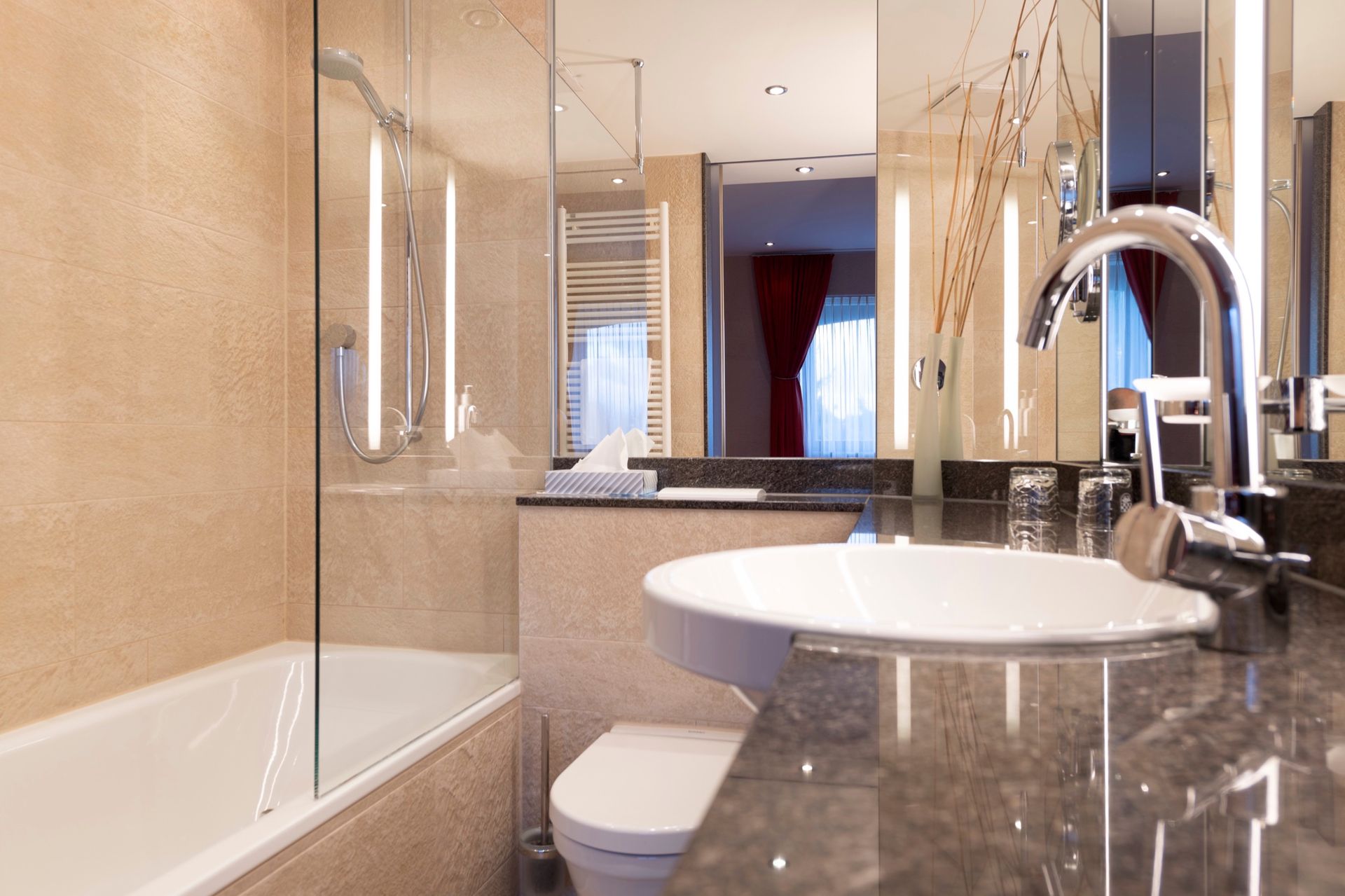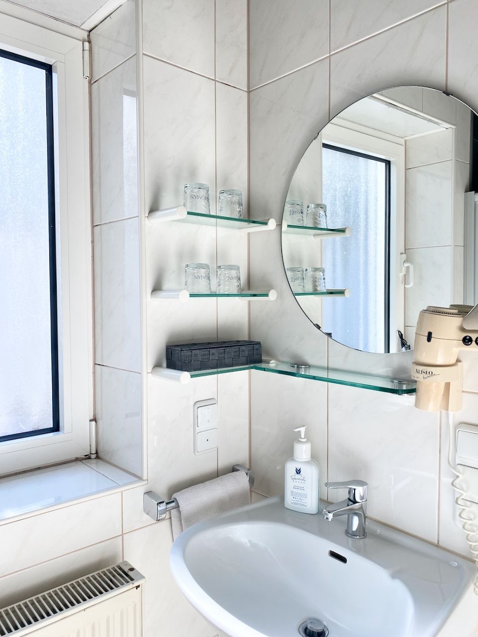 Die Badezimmer machen den Hauptunterschied zur StandART Kategorie aus, mit großflächig verspiegelten Wänden und Naturstein aus Italien.